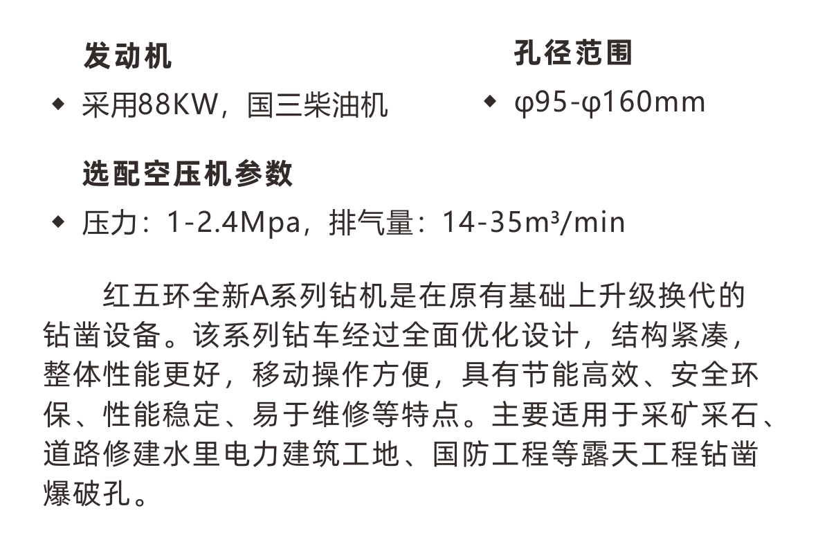 紅五環全新A系列鉆機是在原有基礎上升級換代的鉆鑿設備。該系列鉆車經過全面優化設計,結構緊湊,整體性能更好,移動操作方便,具有節能高效、安全環保、性能穩定、易于維修等特點。主要適用于采礦采石、道路修建水里電力建筑工地、國防工程等露天工程鉆鑿爆破孔。