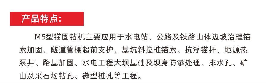 M5錨固鉆車主要應用于水電站、公路及鐵路山體邊坡治理錨索加固、隧道管棚超前支護、基坑斜拉樁錨索、抗浮錨桿、地源熱泵井、路基加固、水電工程大壩基礎及壩身防滲處理、排水孔、礦山及采石場鉆孔、微型樁孔等工程。